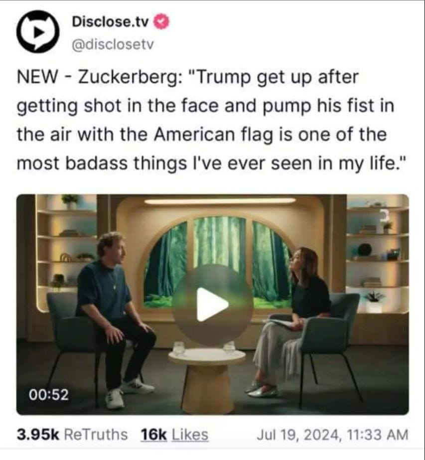 It's counterintuitive to assume this event occurred as narrated, and that Musk and Zuckerberg just happened to have been inspired by his defiant fist pumps to start endorsing his candidacy [1], and that Facebook just happened to start censoring posts that suggest it was scripted [2].