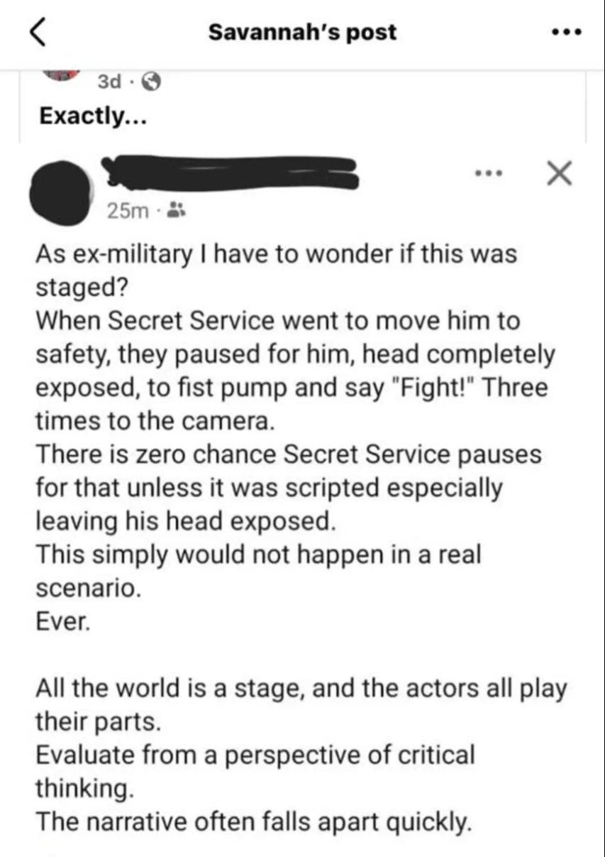 [2] Facebook blocked several images questioning the narrative of 7/13/24, including this one: