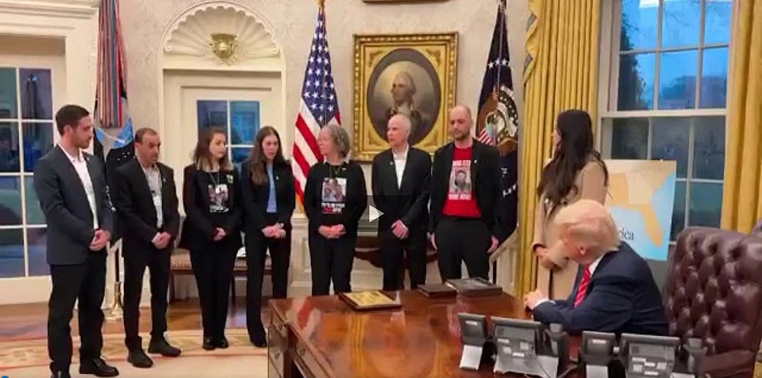 Hostage representatives include: Eli Sharabi, Keith and Aviva Siegel, Naama Levy, Doron Steinbrecher, Yair Horn, Omer Shem Tov, and Noa Argamani